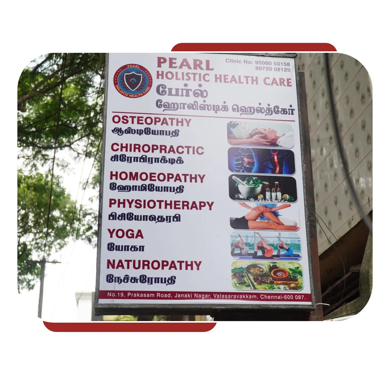 At Pearl Holistic Health Care, Dr. Prasanna Venkatesan offers expert Osteopathic, Chiropractic and Neuro Rehabilitation services tailored to meet individual needs. The clinic is located in Valasaravakkam, Chennai, providing a peaceful and welcoming environment for all patients. The clinic combines state-of-the-art techniques with holistic healing practices, ensuring comprehensive care for those seeking relief and recovery.